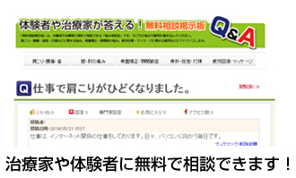 全国の腰痛・膝痛・肩痛などお持ちの方が、相談掲示板を使って全国の治療家に相談できます。日ごろの悩みや疑問を書き込んでください。りらまにあ!会員の方や治療家たちから回答が得られます。